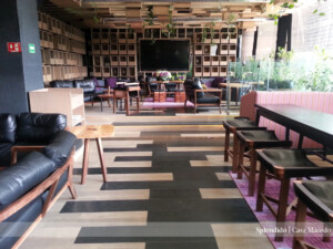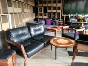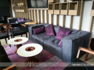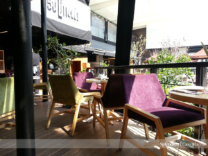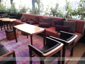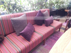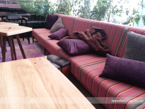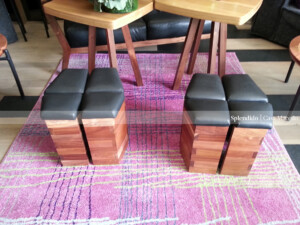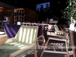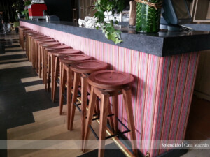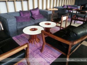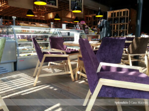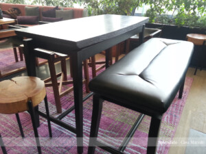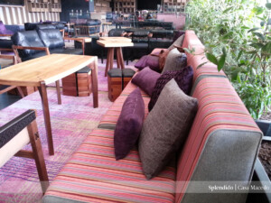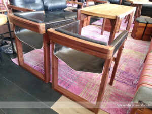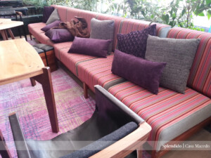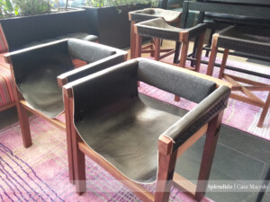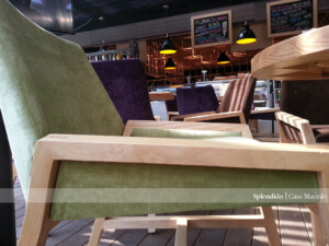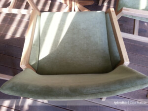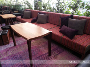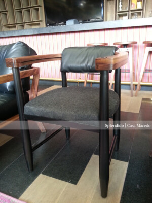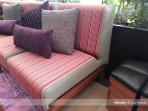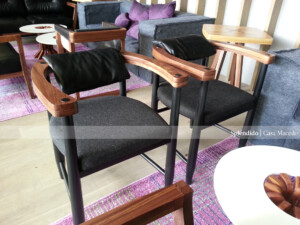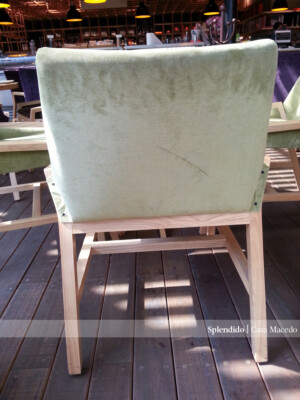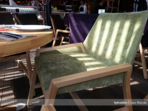 Sillas en base de madera y estructura metálica. Se usó textil 100% poliester repelente al agua.