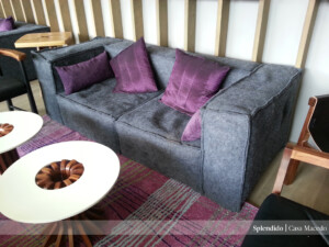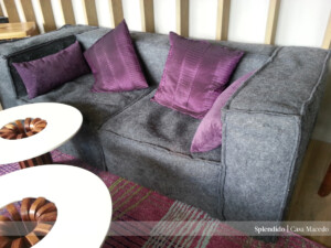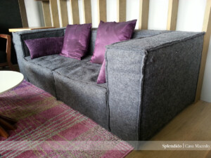 Sofá fabricado en paño de 1/4 de pulgada de espesor, 100 % poliester para mejor mantenimiento. Las uniones son totalmente ¨a hueso¨con sobre costura en todas las orillas.